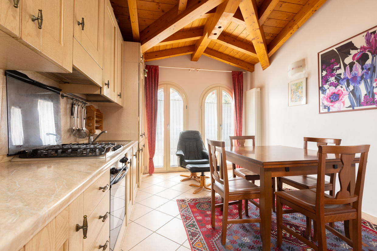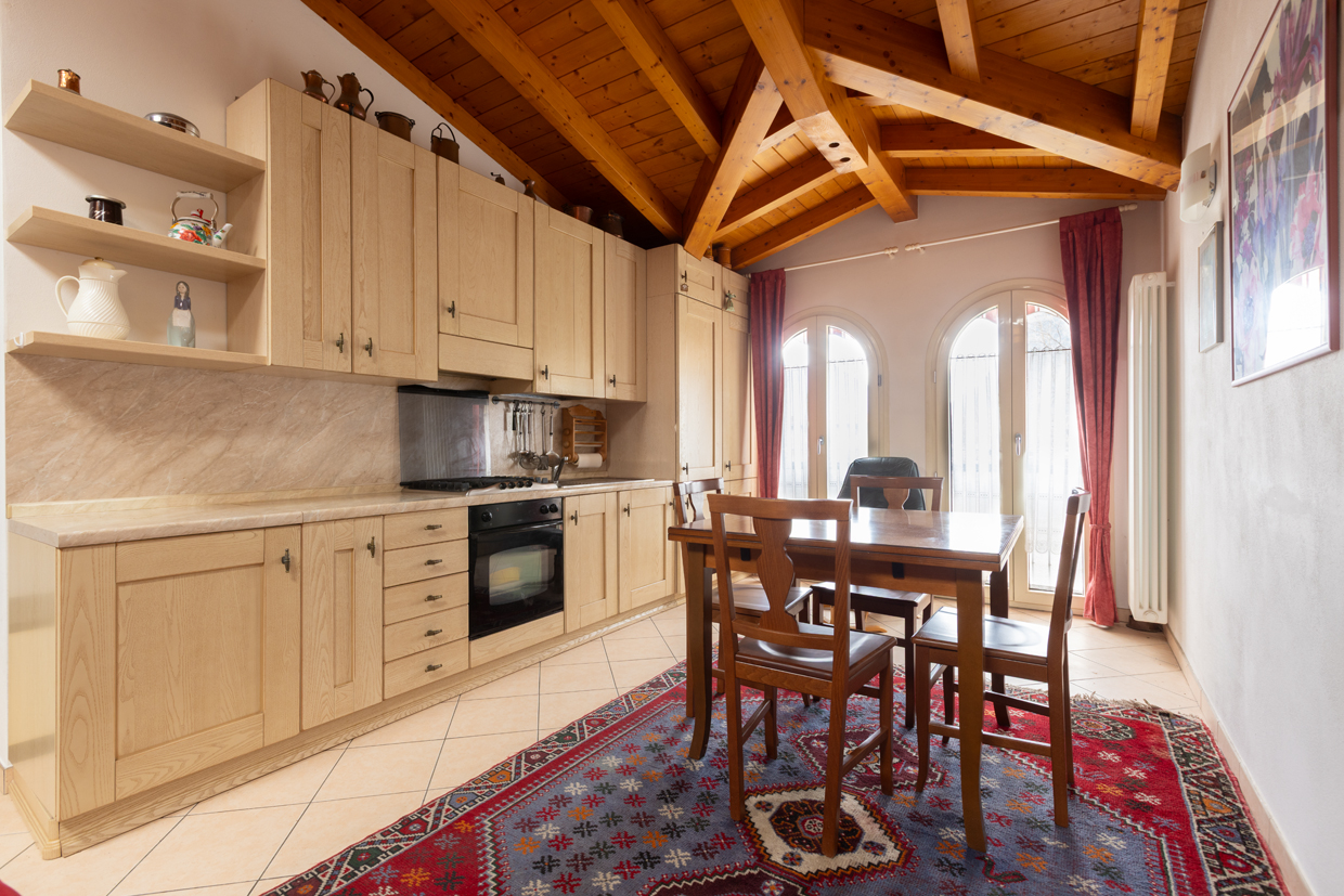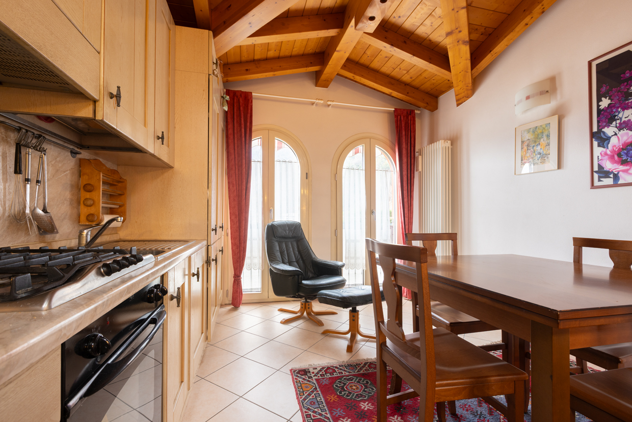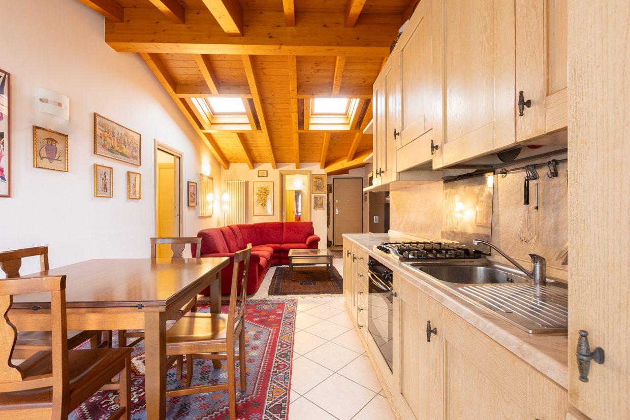 La zona giorno è corredata da una cucina completamente attrezzata. Al servizio del soggiorno è presente un bagno con antibagno, che ospita anche la lavanderia.