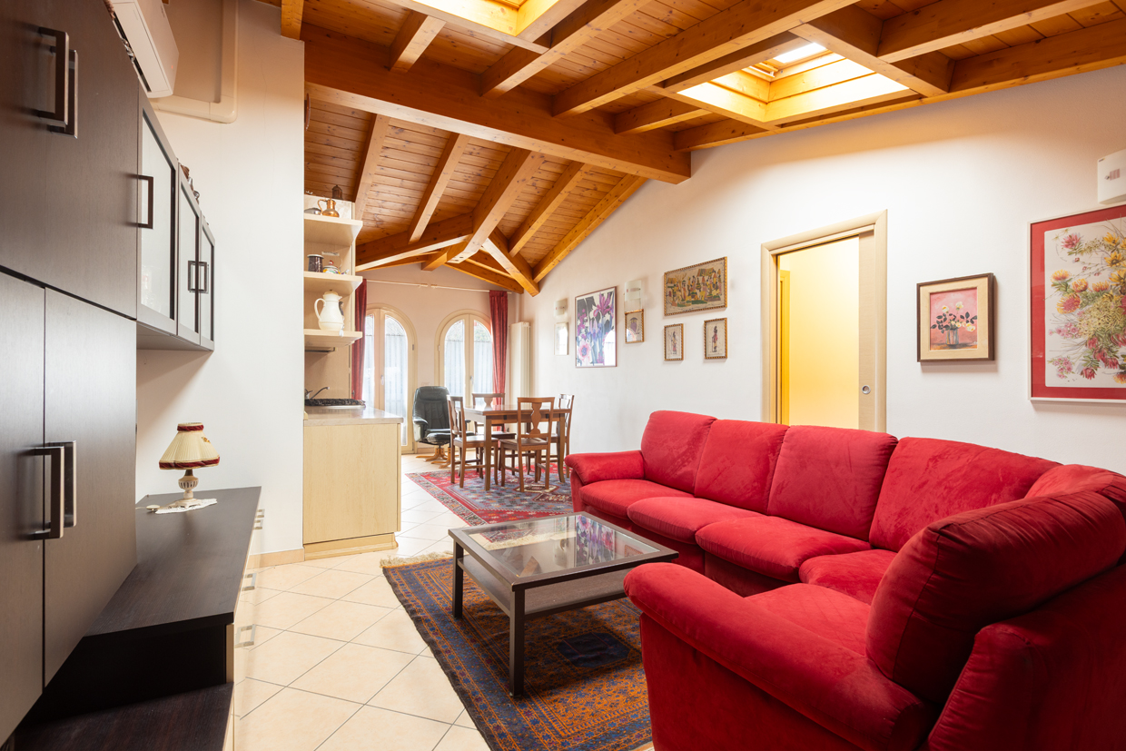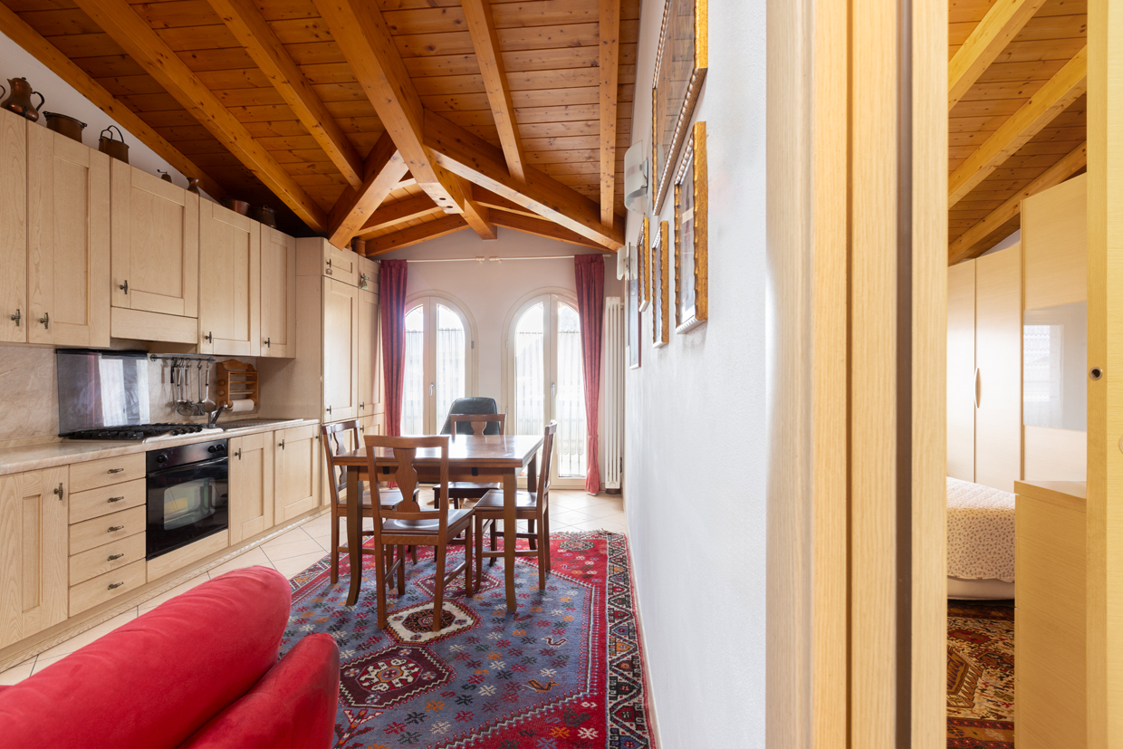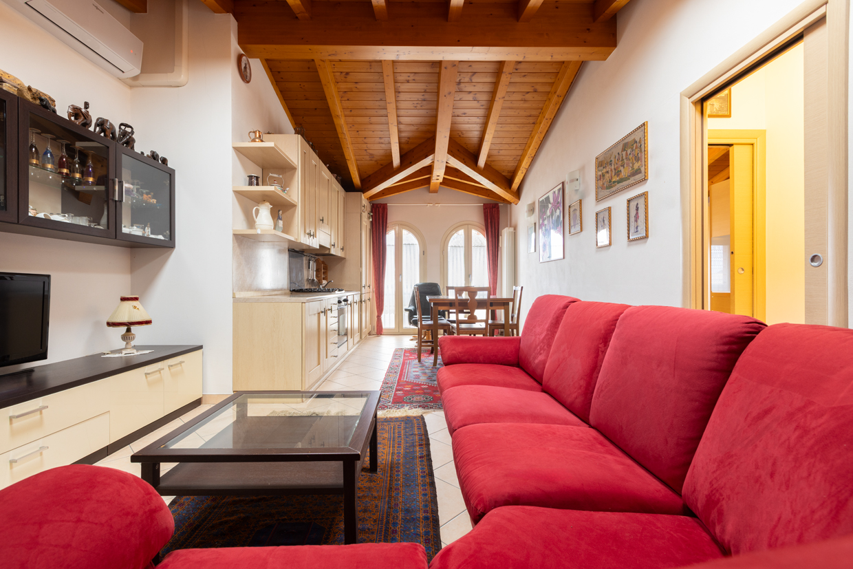 Il soggiorno e la zona pranzo si proiettano su un corridoio che conduce alla parte notte dove si aprono due camere da letto. Un ampio bagno serve la zona dedicata al riposo.